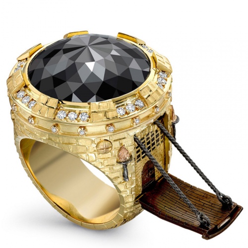 Особого внимания заслуживает бренд Theo Fennell, перстни которого напоминают изящные и интересные украшения с секретом. Например, мужское бриллиантовое кольцо Davy Jones' Locker содержит в себе маленький сундук, наполненный сокровищами, а его боковины декорированы бирюзовой эмалью, на которой изображены красочные обитатели морских глубин. Не менее привлекательный и уникальный шедевр – перстень Castle, выполненный форме золотого замка, покрытого огромным черным бриллиантом, с боку которого расположен выдвигающийся мост.